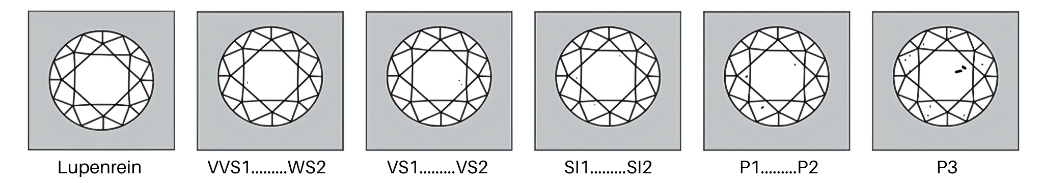 Die Reinheit eines Diamanten wird anhand einer Skala eingeteilt, die von lupenrein (FL) bis zu deutlichen Einschlüssen (P3) reicht.